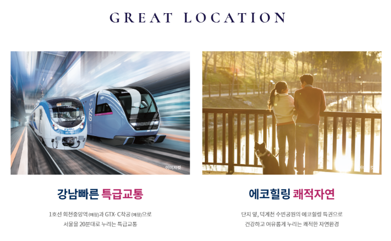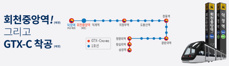 광역 교통 호재로는 GTX-C 노선이 있는데요 종착역인 덕정역과 1정거장 밖에 안 돼 개통이 되면 서울 강남과의 접근성이 대폭 상승하여 일대 부동산 시장에 긍정적인 영향에 큰 도움이 될 것입니다.