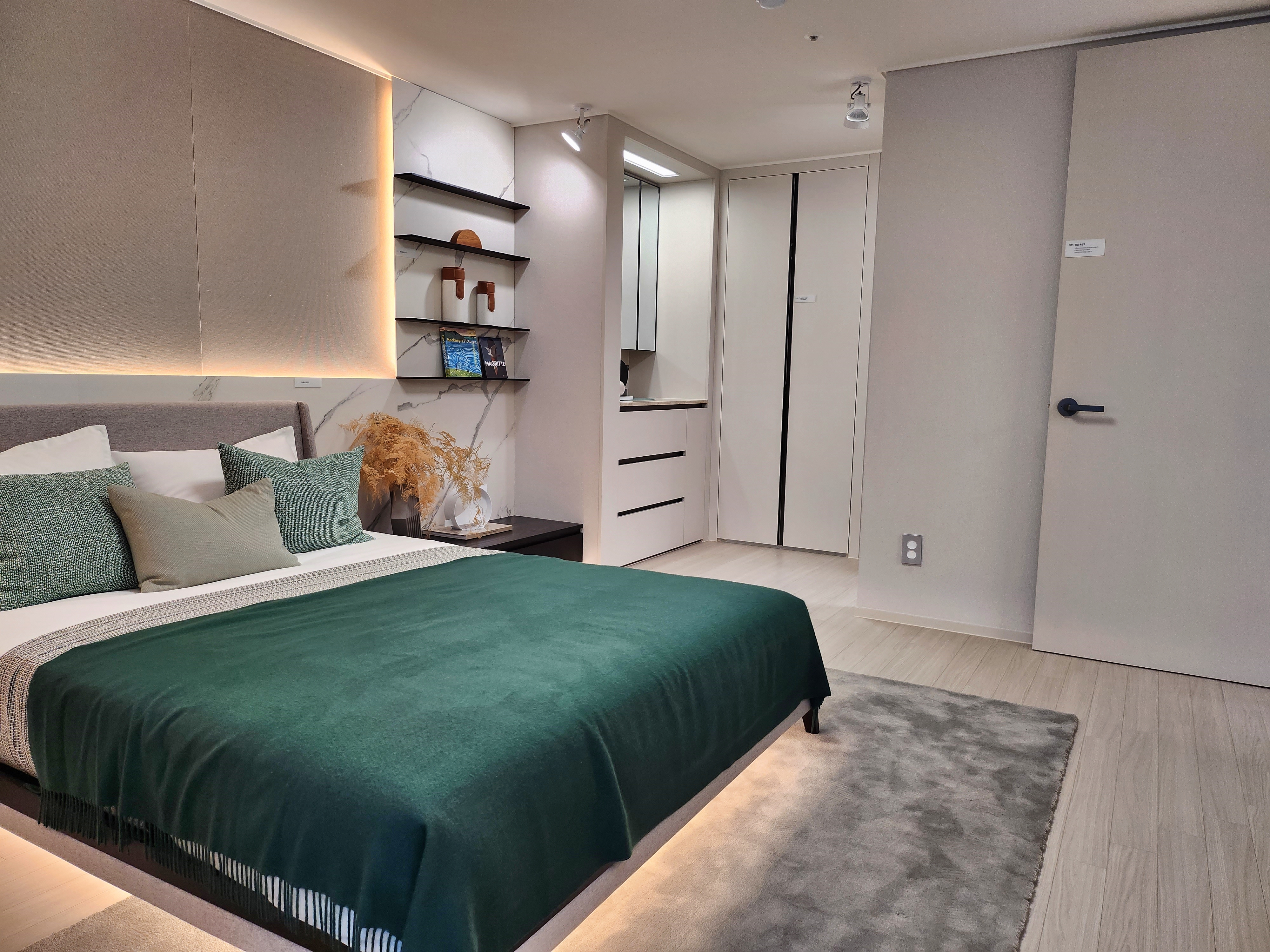 인테리어 컨셉은 평형별 그레이와 베이지를 기본 컬러로 하였고, 우물천장, 아트월, 엔지니어드스톤, 강마루 등의 고급 마감재를 사용하였습니다. 또한 드레스룸, 냉장고장 등의 편리한 가구와 가전도 기본으로 제공됩니다.