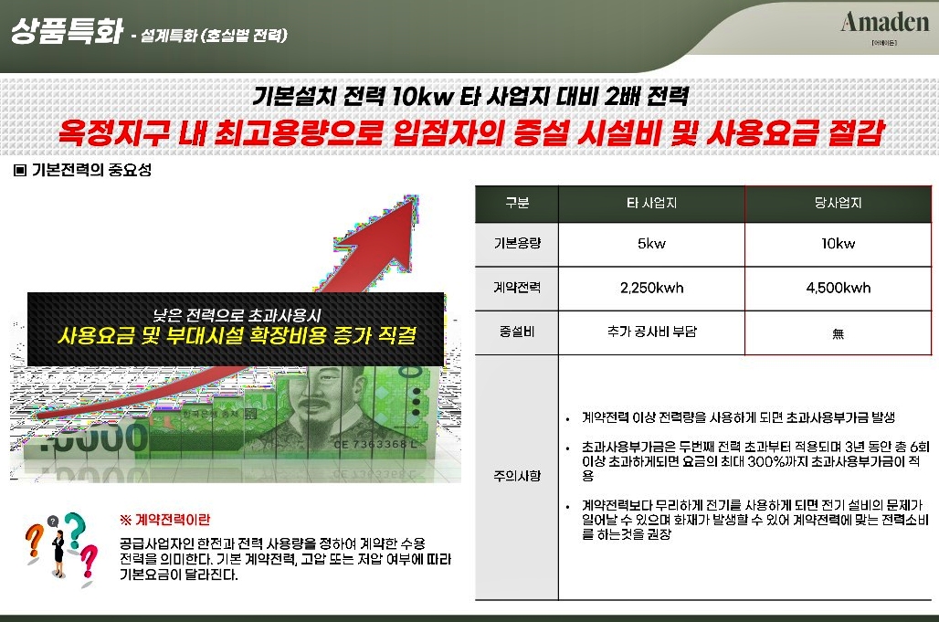 옥정 신도시 어메이든 상가는 입점자들의 편의를 위해 전력 공급량이 10kw로 공급이 되어 타 상가들에 비해 전력 공급량이 높아서 추가로 전력 증설 비용을 절약할 수 있습니다.