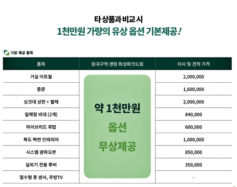동대구역 센텀 화성파크드림은 다른 아파트 분양 상품과 배교해 보아도 1천만원 가량의 유상 옵션을 기본 제공해 드리고 있습니다. 실외기 전동 루버, 절수형 화장실 센서, 주방 TV, 싱크대 상판, 거실 아트월, 등 갖추어져 있습니다. 이러한 옵션들은 파크드림의 고급스러움과 편리함을 더해 줍니다.