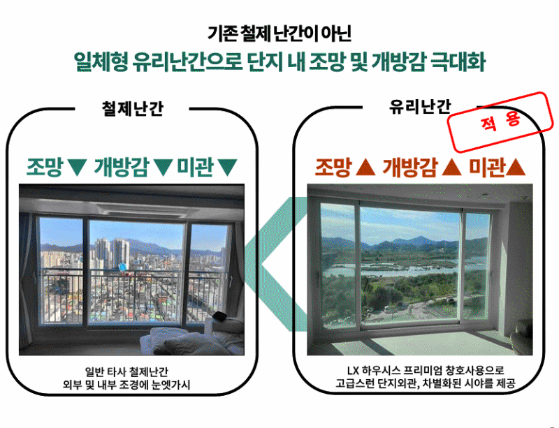 기존 철재 난간이 아니라 일체로 이루어진 유리 난간으로 단지 내 조망 및 개방감도 극대화하고, 에너지 절약도 가능합니다.