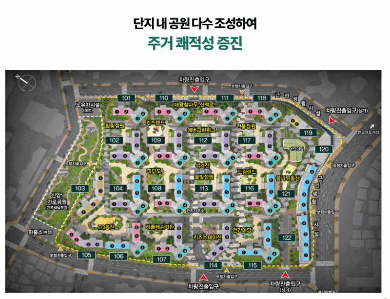 단지 내 공원이 다수로 조성되어 주거 쾌적성이 높고, 다양한 커뮤니티 시설이 갖추어져 있음