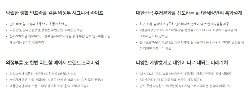 메이저 브랜드인 이편한세상 브랜드로 건립이 되는 의정부 신곡 이편한세상 시그니처 뷰는 의정부에서 검증되는 이편한세상 4번째 아파트 입니다. 디지털 조선일보와 한국 소비자 포럼에서 주관한 소비자가 뽑은 가장 신회하는 브랜드 대상과 대한민국 올해의 브랜드 대상에서 19회 수상하는 등, 소비자의 신뢰아 사랑을 바탕으로 꾸준히 성장하고 있는 아파트 입니다.