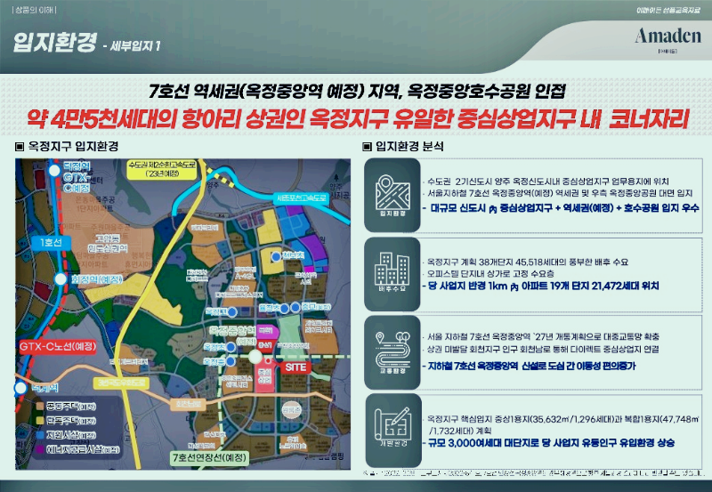다른 신도시에 비해 상가 분양가 또한 저렴한 편이어서 수익률을 높일 수 있는 좋은 요소입니다. 옥정신도시 상가 어메이든은 아파트 단지들에 둘러싸인 항아리 상권으로 안정적인 수익 창출이 가능합니다. 그리고 앞으로 7호선 옥정 중앙역이 개통되면, 초역세권 상권으로 주목 받을 수 있습니다.