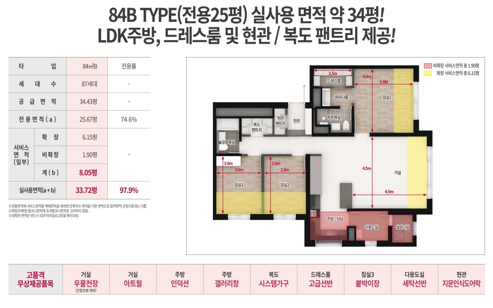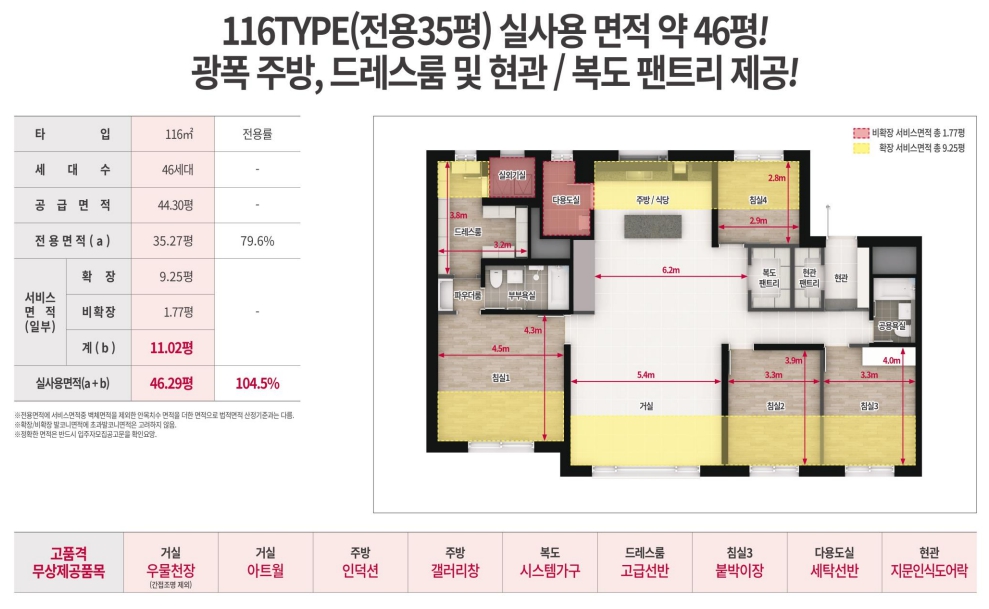 여기에 평형별로 살펴보면 , 59타입은 실사용 면적이 25평가량이고 드레스룸과 복도 팬트리가 제공됩니다. 84타입은 실사용 면적이 35평 정도에 광폭 주방, 드레스룸, 현관과 복도의 팬트리 공간이 제공되는 등 넉넉한 시설을 보여줍니다. 116타입은 실사용면적이 48평으로 가장 넓은 평형이며, 거실과 주방이 분리 되어 있고, 드레스룸과 팬트리 공간이 넓게 마련되어 있습니다.