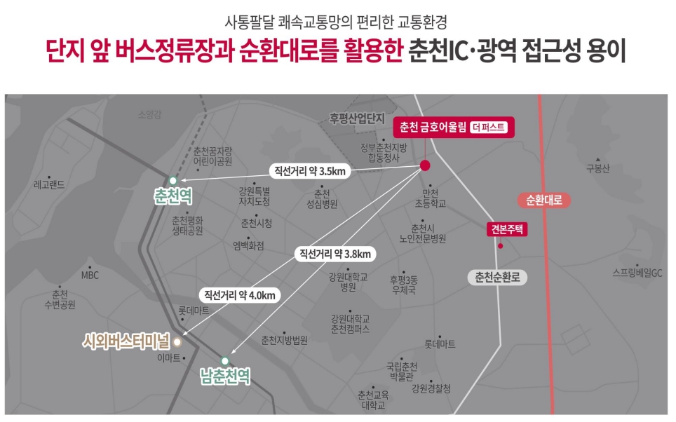 춘천 아파트 분양을 고려하시는 분들이 많이 살펴보는 것이 교통 환경인데요. 인근에 고속, 시외버스 터미널이 자리하였음은 물론이고 춘천 나들목과 춘천역 인접하기 때문에 사통팔달 편리한 교통망이 구축되었습니다.