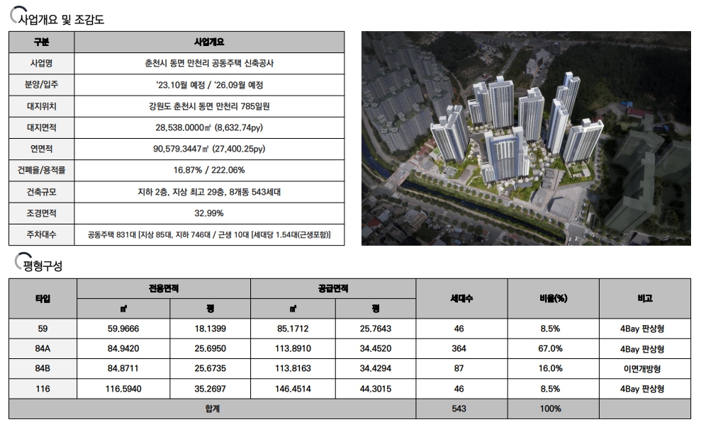 이번에 소개해 드리고자 하는 춘천 신축아파트는 춘천시 동면 만천리 일원에 지어지는 아파트로, 대지면적은 8,600여 평에 연면적은 2만 7천평 가량입니다. 건폐율과 용적률은 각각 16%, 222%로 적정 수준을 유지하고 있습니다. 규모는 지하2층에서 지상 29층까지의 8개 동으로 구성되며, 공급 물량은 전용 면적 59, 84, 116 제곱미터로 총 543세대가 선보이게 됩니다. 여기에 주차 대수는 세대 당 1.54대로 상당히 넉넉하게 잡혔습니다.