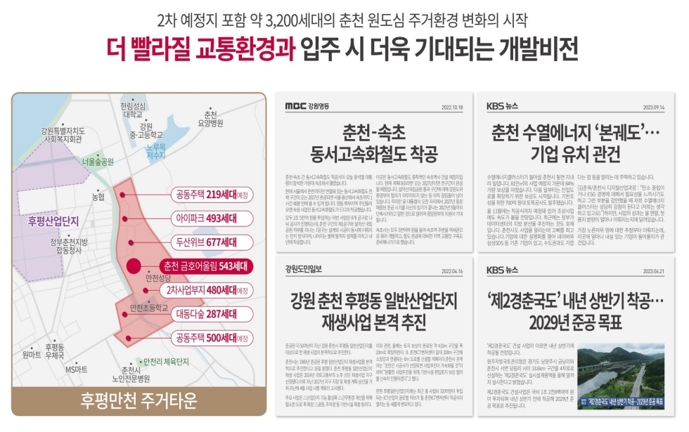 특히 춘천에서 속초로 이어지는 동서 고속화 철도와 제2 경춘국도 개발 사업이 현재 진척 중인데요. 이런 교통 호재들이 겹치게 되면 교통 인프라가 강화되는 것은 물론이고 지역 발전에도 막대한 힘을 실어 주게 될 것입니다.