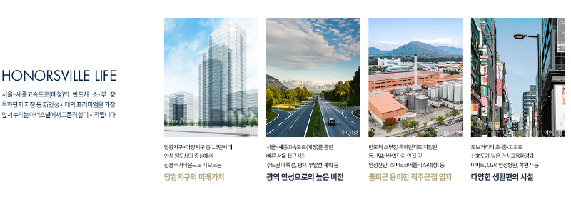 이곳은 뛰어난 교통망과 생활 편의 시설, 에코 힐링 라이프를 모두 갖춘 곳입니다. 또한 반도체 소부장 특화 단지로 지정된 동산일반산업단지 인접과 안성 산단, 스마트코어 폴리스 등의 예정으로 출퇴근이 용이한 직주 근접 입지를 선점하고 있습니다.