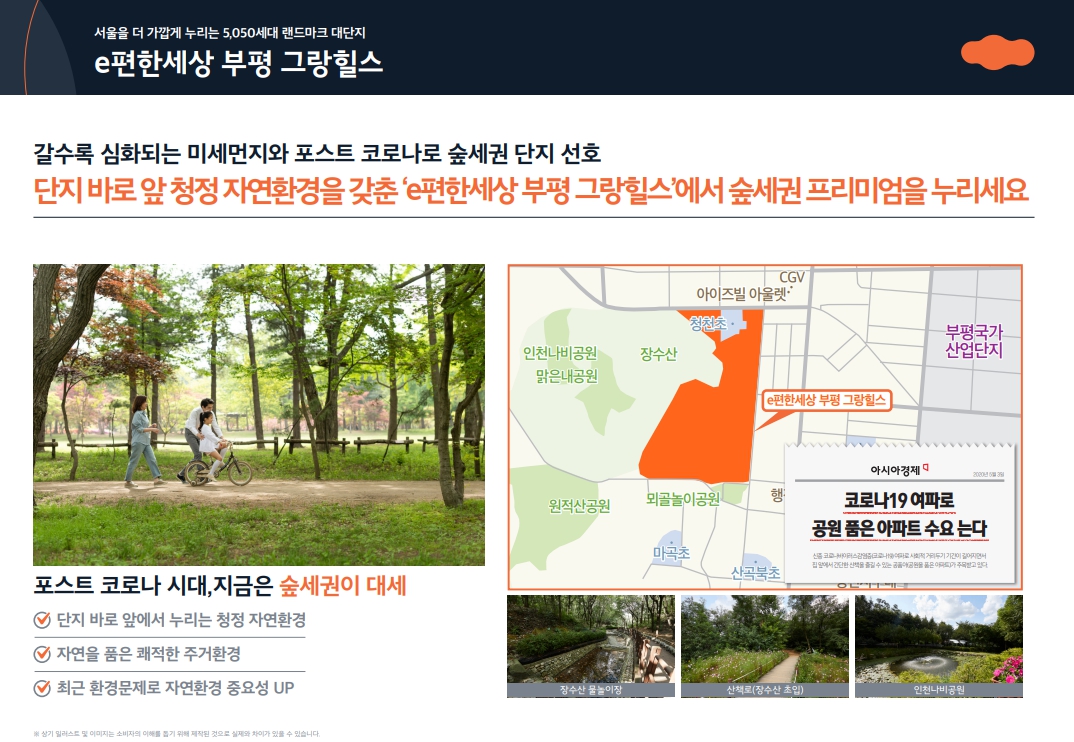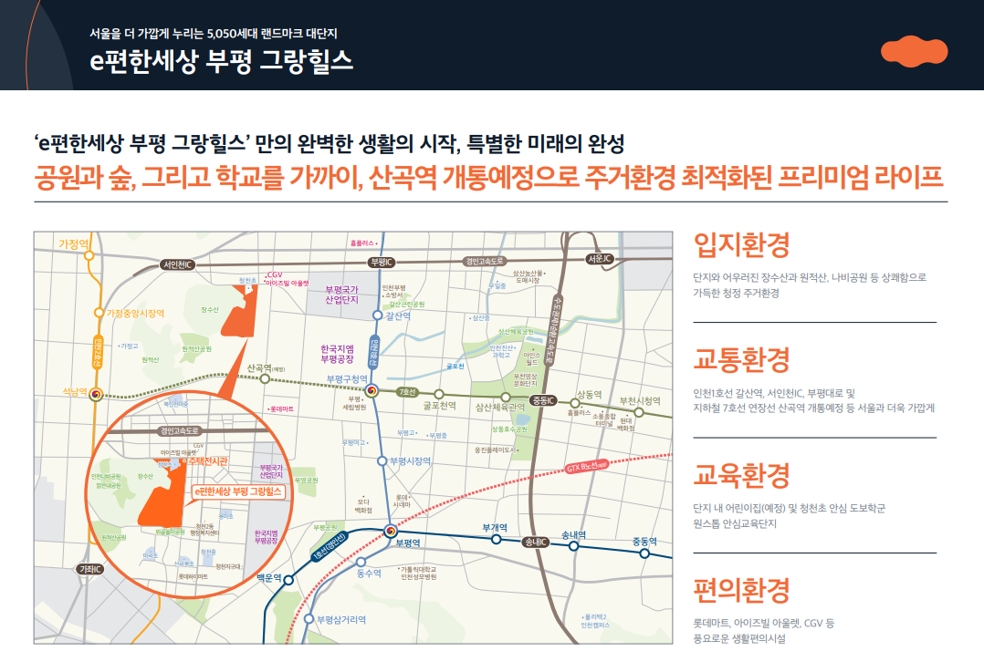 부평 이편한세상 그랑힐스 민간임대아파트는 교통과 자연환경 모두를 만족시키는 이상적인 위치에 자리 잡고 있습니다. 7호선 부평역으로의 무료 셔틀버스운행은 물론, 장수산과 나비공원 등의 자연환경이 가까이에 있어 일상 속 작은 휴식을 제공합니다.