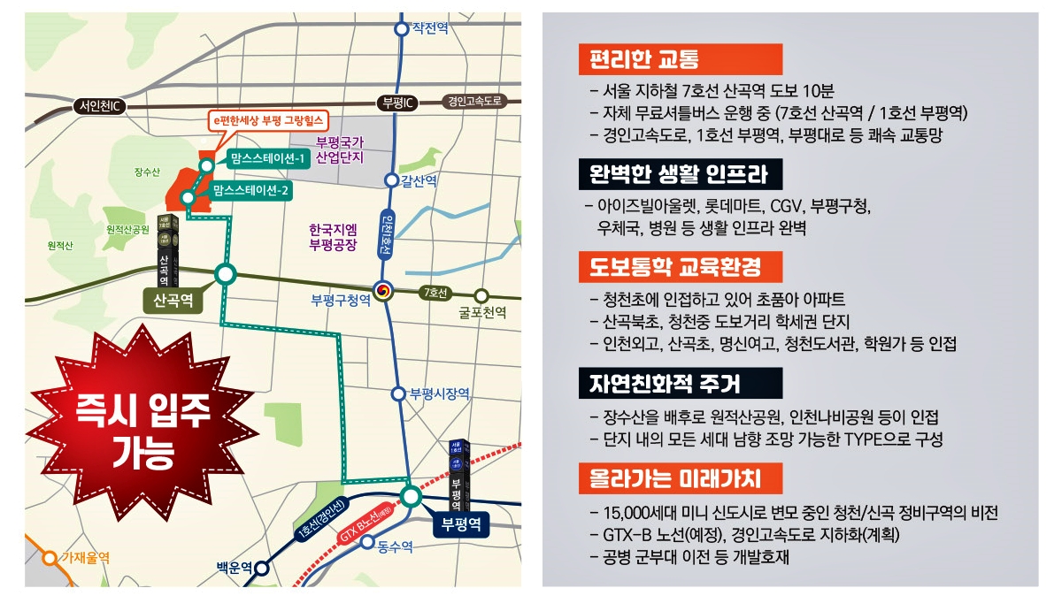 부평 이편한세상 그랑힐스 민간임대아파트는 인천광역시 부평구 부평대로에 위치하고 있습니다. 이 지역은 교통편이 좋아 서울과의 접근성이 우수합니다. 또한 인근에는 대중교통이 잘 발달해 있어 편리한 이동이 가능합니다. 그랑힐스는 주변에 공원과 녹지 지역이 있어 자연과 조화를 이루고 있으며, 주택 지역으로 조용하고 안전한 환경을 제공합니다.