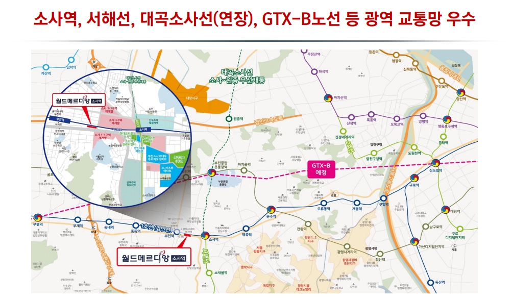 소사역 월드메르디앙은 부천역과 소사역의 더블 역세권에 위치해 있어, 서울과 인천을 잇는 교통의 요충지로서의 역할을 톡톡히 하고 있습니다. GTX-B 노선과의 연결을 통해 서울역까지 단 12분이면 도달할 수 있는 놀라운 접근성을 제공합니다.
