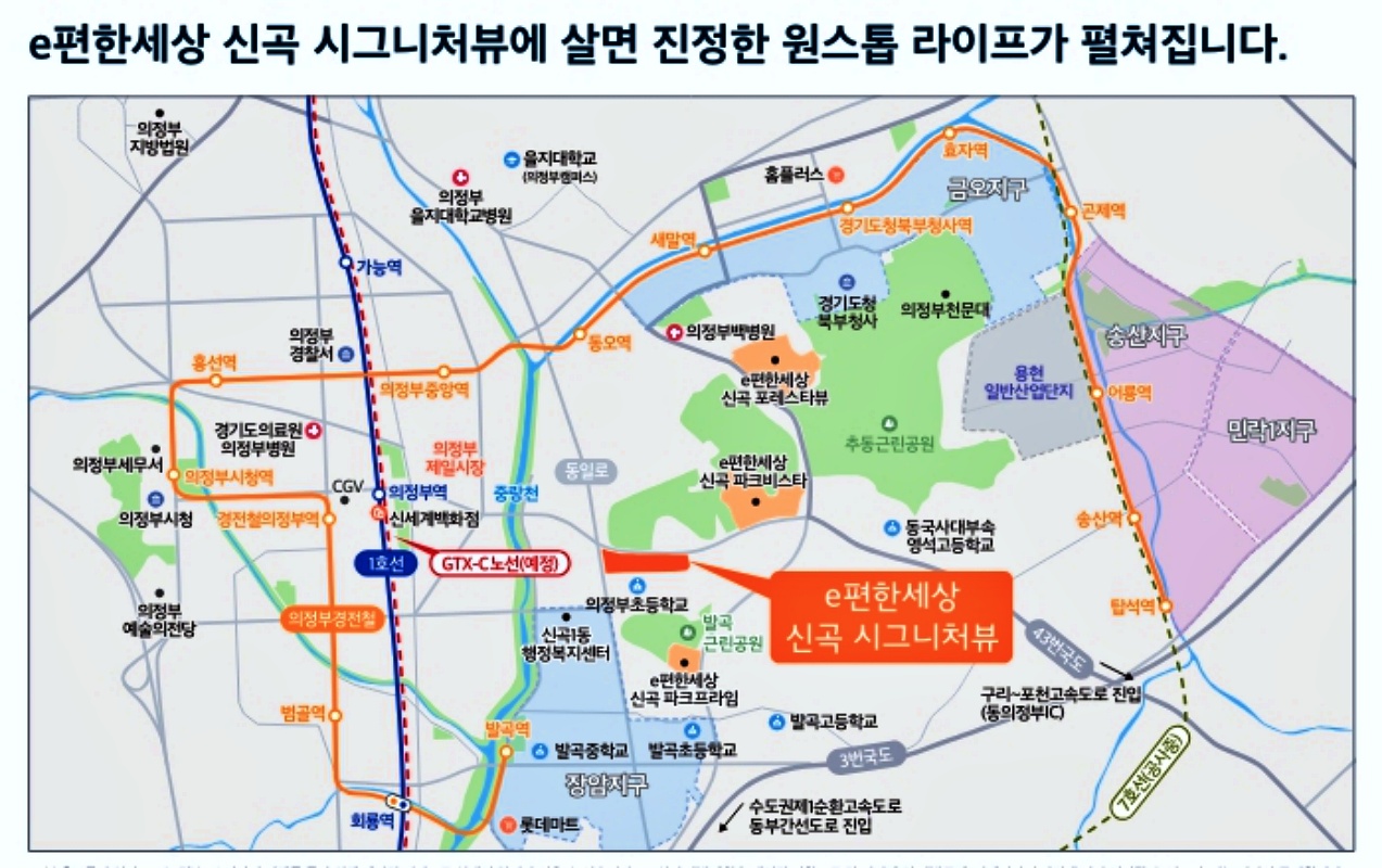 e편한세상 신곡 시그니처 뷰가 건립이 되는 의정부 신곡동은 자연과 도심이 조화를 이루고 있는 지역이에요. 중랑천과 발곡근린공원, 추동공원 등이 인접해 있어 여가 시간을 보내거나 휴식을 취하기에 이상적인 환경을 제공합니다. 또한 신세계 백화점과 롯데마트, 다양한 병의원 등이 1.5km 이내에 위치해 있어 일상생활에 필요한 편의시설 접근성이 뛰어나요.