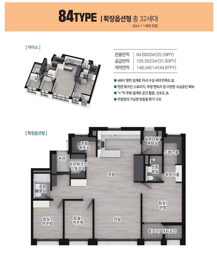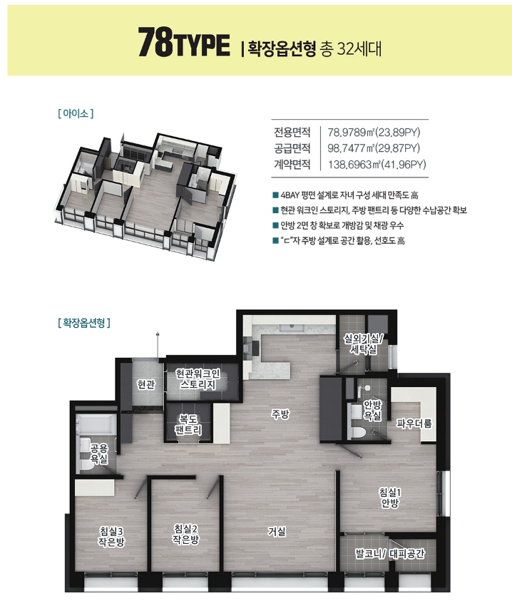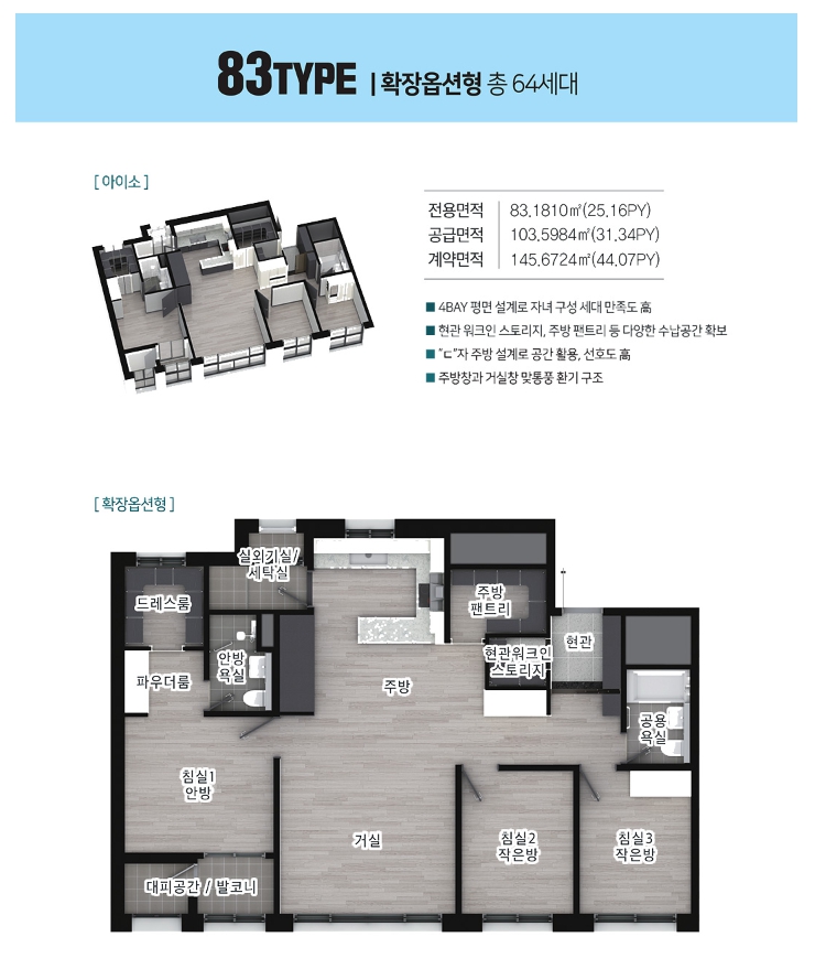 내부는 4bay 판상형으로 구성되어 있어서 쾌적한 생활을 보장해요. 78제곱미터는 ㄷ자 레이아웃의 주방 설계로 동선이 깔끔하고 수납공간이 많아요. 현관 워크인 스토리지와 복도 팬트리도 있어서 수납이 편리하답니다. 83, 84제곱미터는 맞통풍이 가능하여 환기에 용이하고 , 드레스룸이 추가되어 의류 정돈이 더욱 효율적이에요.