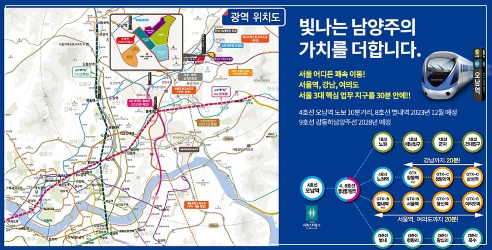 남양주 오남역 서희스타힐스는 뛰어난 교통 접근성과 풍부한 자연환경, 우수한 교육 여건 등을 갖춘 대규모 아파트 단지로, 향후 시세 상승과 안정적인 주거 환경을 동시에 기대할 수 있는 최적의 선택지입니다. 4호선 오남역 개통에 이어 8호선과 GTX 노선의 개발 호재까지 이어지는 이 단지는 서울 접근성이 크게 향상되면서 더욱 가치 있는 투자가 될 것입니다.