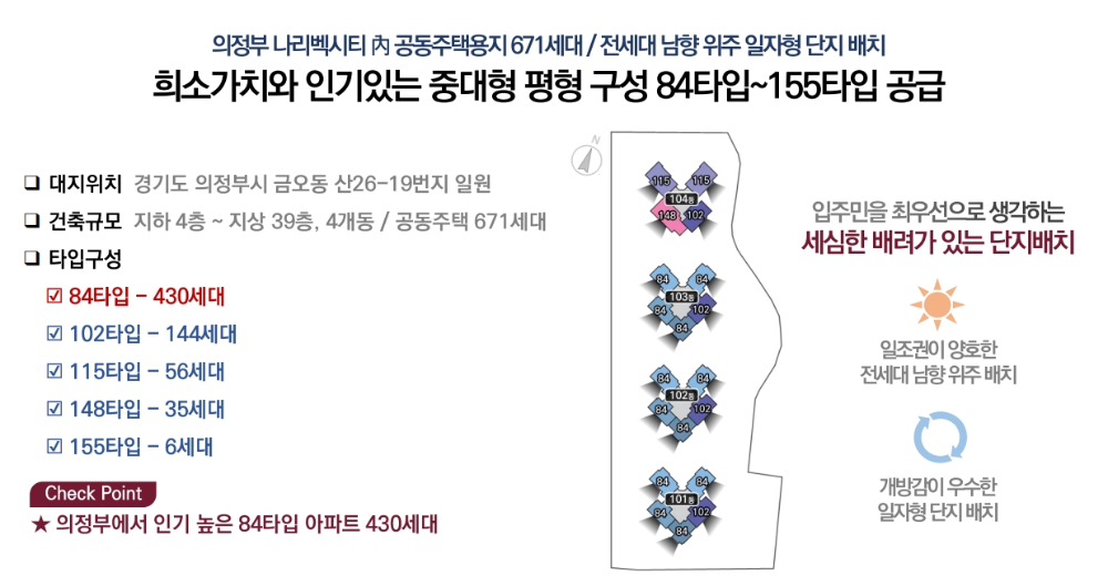 가장 작은 평형이 84㎡부터 시작하여 155㎡까지 널찍한 평형대가 마련되어 있어 가족 단위 실수요자들에게 특히 인기가 높을 것으로 예상됩니다. 다양한 크기의 평형대를 갖추어 선택의 폭을 넓혔습니다.