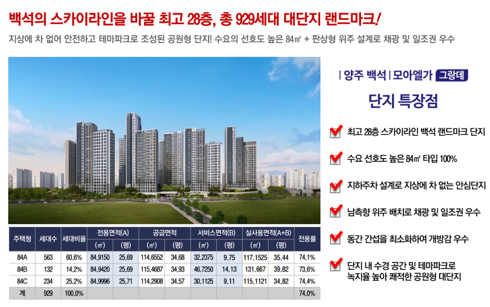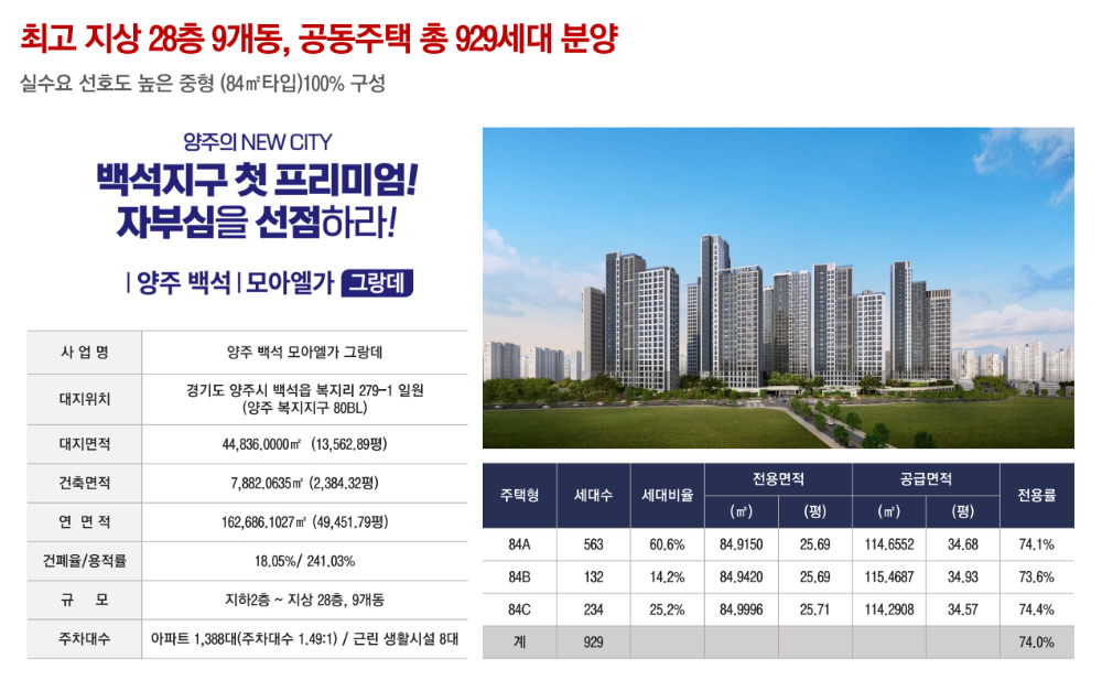 양주 백석지구에 위치한 "양주 백석 모아엘가 그랑데"는 총 929세대 규모의 대단지 아파트입니다. 모아건설산업(주)이 시공을 맡았으며, 이 아파트는 양주 서부권 개발의 시작점이 될 중요한 프로젝트로 주목받고 있습니다. 청약 접수는 이미 마감되었으며, 당첨자 발표는 10월 2일로 예정되어 있습니다.