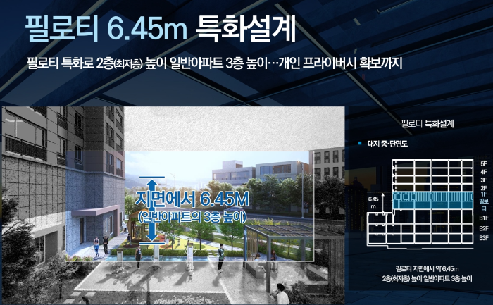 필로티 설계를 통해 저층 세대의 프라이버시를 보장하고, 개방감 있는 공간을 제공합니다. 일반 아파트의 3층 높이에 해당하는 약 6.45m 높이의 필로티는 저층 세대에게도 탁 트인 공간감을 선사하며, 자연 채광이 잘 들어오도록 설계되었습니다.