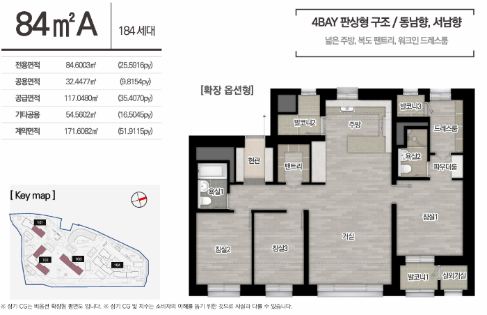 84㎡ A타입은 4 BAY 판상형 구조로, 동남향과 서남향을 선택할 수 있는 184세대로 구성되어 있습니다. 넓은 주방과 복도 팬트리, 워크인 드레스룸이 포함된 이 구조는 특히 가족 단위의 입주자들에게 적합합니다.