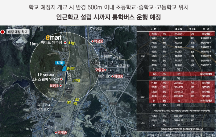 이마트, LF스퀘어와 인접한 생활 인프라는 물론, 도보로 이동 가능한 초등학교와 중학교가 있어 자녀를 둔 가족 단위의 입주자들에게 적합합니다. 또한 향후 유치원과 고등학교 등의 교육 기관 확장 계획도 있어 학군 환경도 만족스럽습니다.