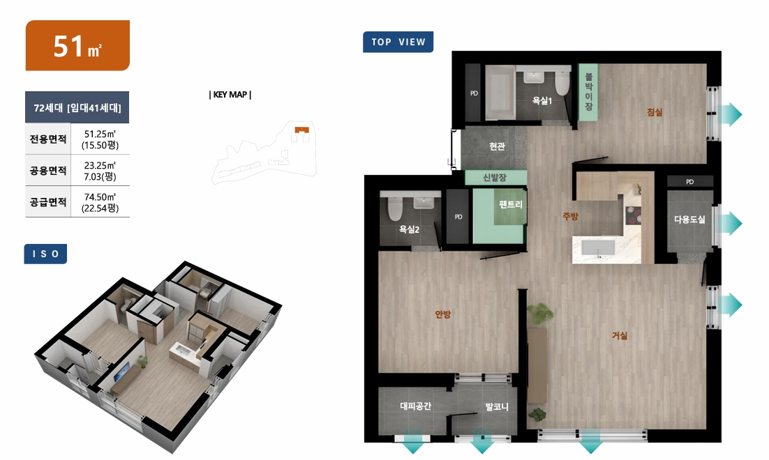 - 51m² 타입: 방 2개, 욕실 2개, 주방, 거실, 발코니, 드레스룸, 팬트리, 다용도실로 구성되어 있습니다. 거실 2면이 개방형 설계로 채광과 조망권이 뛰어나며, 실용적인 공간 활용이 가능합니다.