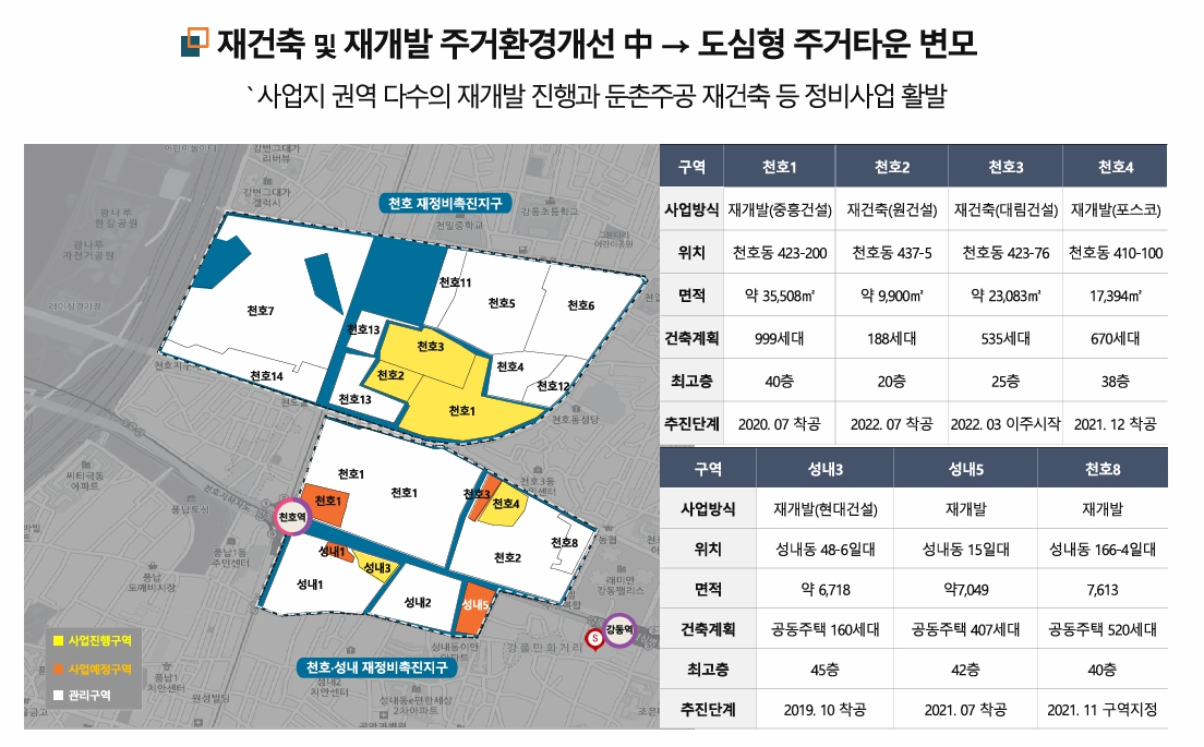 A4. 천호동과 길동 일대에서 재개발 및 정비사업이 활발히 진행 중이며, 지가 상승 기대감이 높은 지역입니다.
