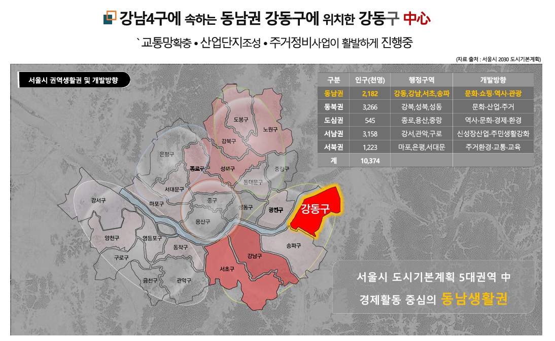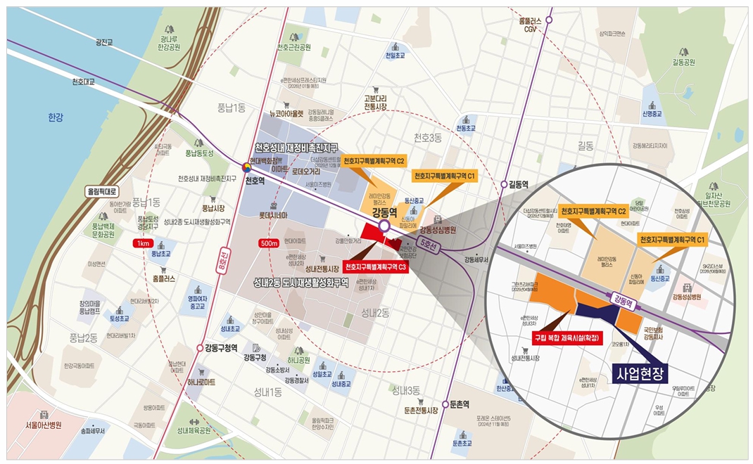 현재 강동역 주변은 역세권 활성화 사업과 도시정비형 재개발이 활발히 이루어지고 있으며, 천호지구 지구단위계획, C3특별계획구역 개발 등 장기적인 도시 계획도 구체화되고 있습니다. 이러한 점에서 강동역 인근은 장기적인 관점에서도 가치 상승이 기대되는 지역입니다.