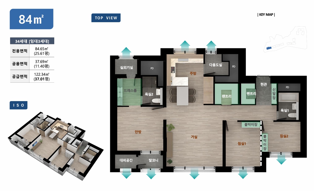 - 84m² 타입: 방 3개, 욕실 2개, 주방, 거실, 발코니, 다용도실, 드레스룸, 팬트리 2개를 포함한 대형 평형입니다. 넉넉한 수납 공간과 맞통풍 구조로 거주 만족도가 높습니다.