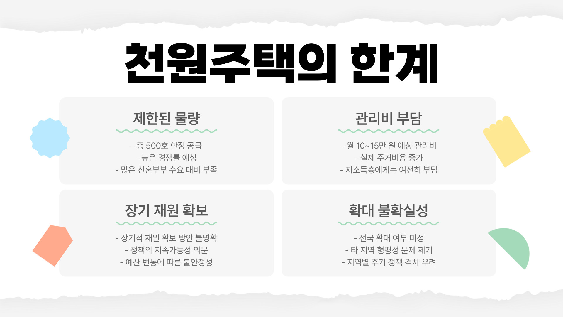 천원주택은 저렴한 가격과 좋은 입지 때문에 많은 신혼부부들에게 관심을 받고 있지만, 현실적으로 몇 가지 한계도 있어요.