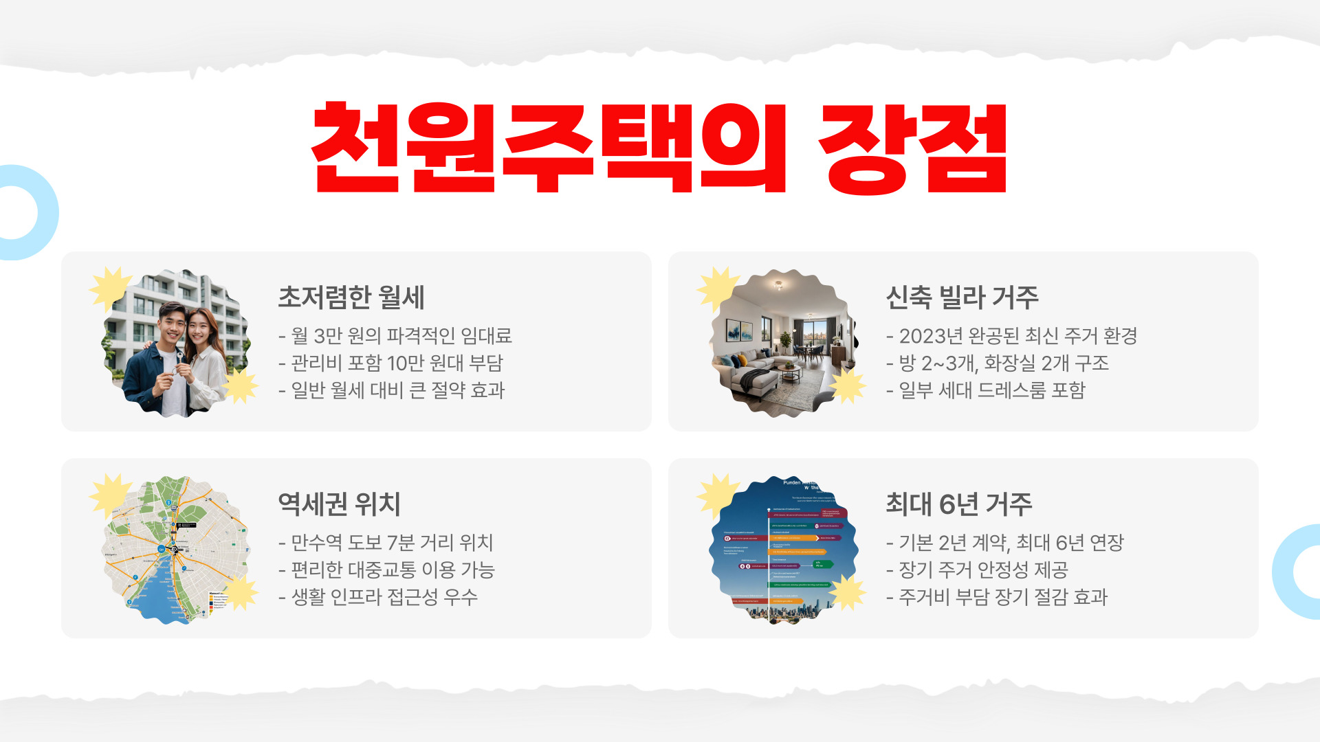 ✔ 장점: - 초저렴한 월세 (월 3만 원) - 신축 빌라에서 거주 가능 - 역세권 위치로 출퇴근 편리 - 최대 6년까지 거주 가능