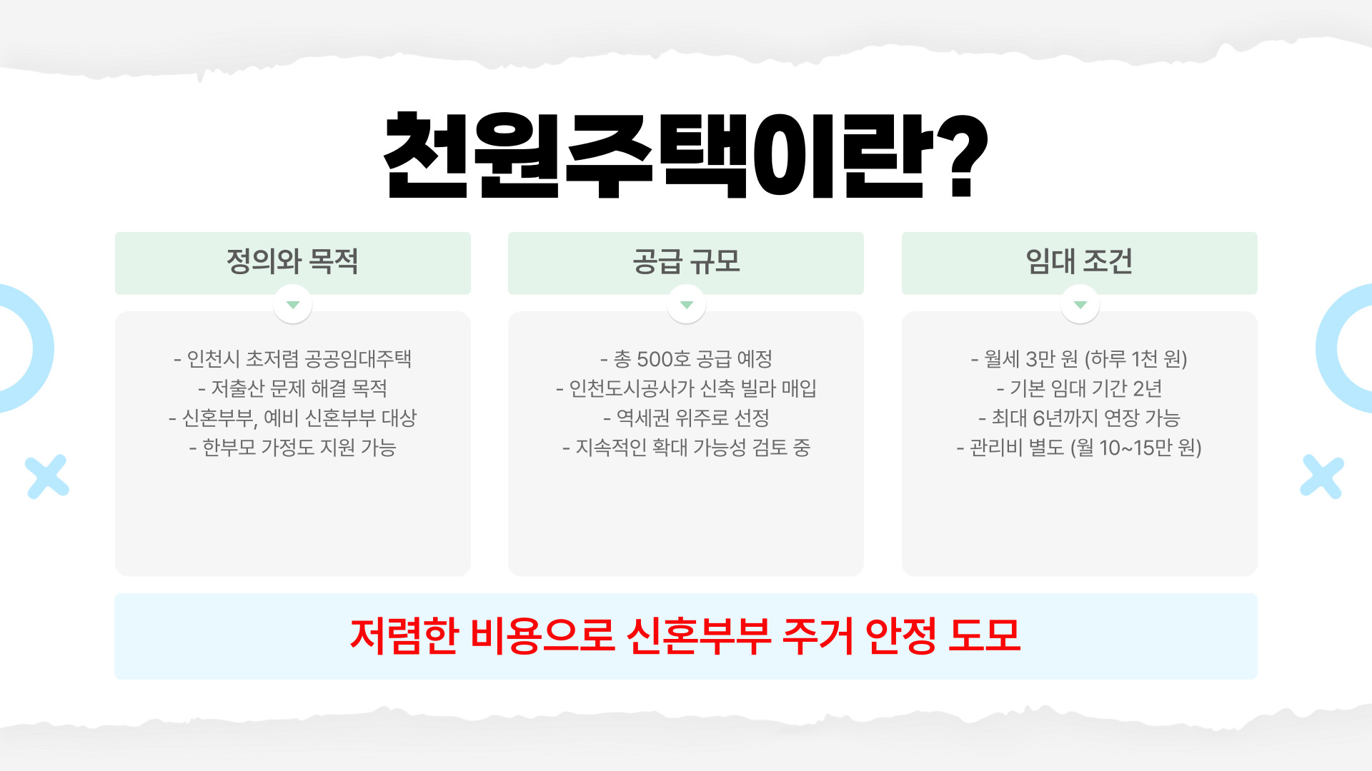 천원주택은 인천시가 저출산 문제 해결과 신혼부부의 주거 지원을 위해 만든 초저렴 공공임대주택이에요. 신혼부부 또는 예비 신혼부부, 한부모 가정을 대상으로 하며, 월세 3만 원이라는 파격적인 가격이 특징이죠.