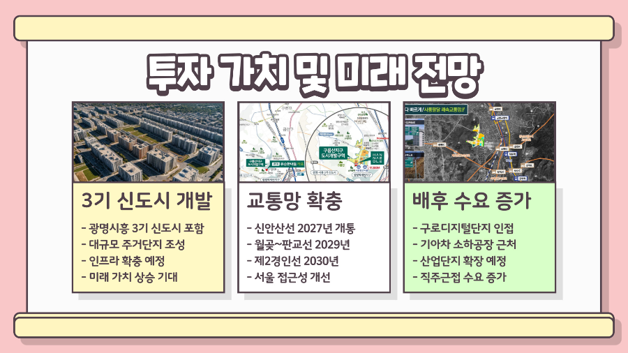 📍 광명시흥 3기 신도시 개발: 광명시는 수도권에서 가장 주목받는 개발 지역 중 하나예요. 특히 광명시흥 3기 신도시가 조성되면서 인프라 확충과 인구 유입이 활발하게 이루어질 예정이에요.