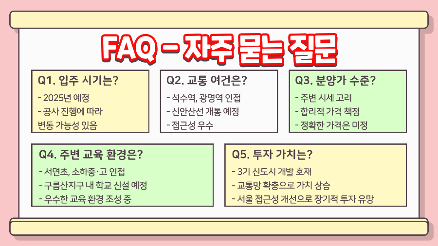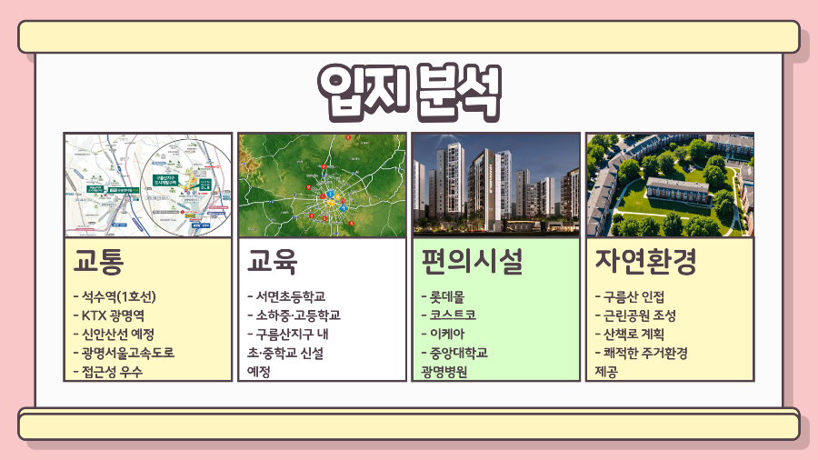 🚆 교통: 석수역(수도권 1호선)과 KTX 광명역이 가까워 서울 및 전국 주요 도시로 이동이 편리해요. 여기에 광명서울고속도로와 신안산선 복선전철 개통(2027년 예정)로 접근성이 더욱 좋아질 전망이에요.