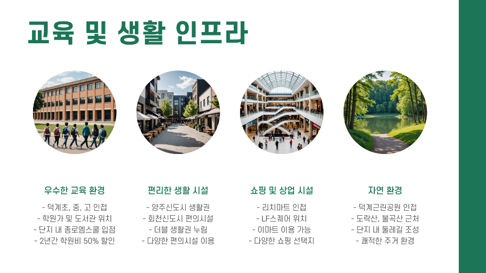 덕계역 한신더휴 포레스트는 교육뿐만 아니라 생활 인프라도 풍부해요. 양주신도시의 다양한 상업 시설과 회천신도시의 편의시설까지 이용할 수 있어 더블 생활권을 누릴 수 있는 입지예요.