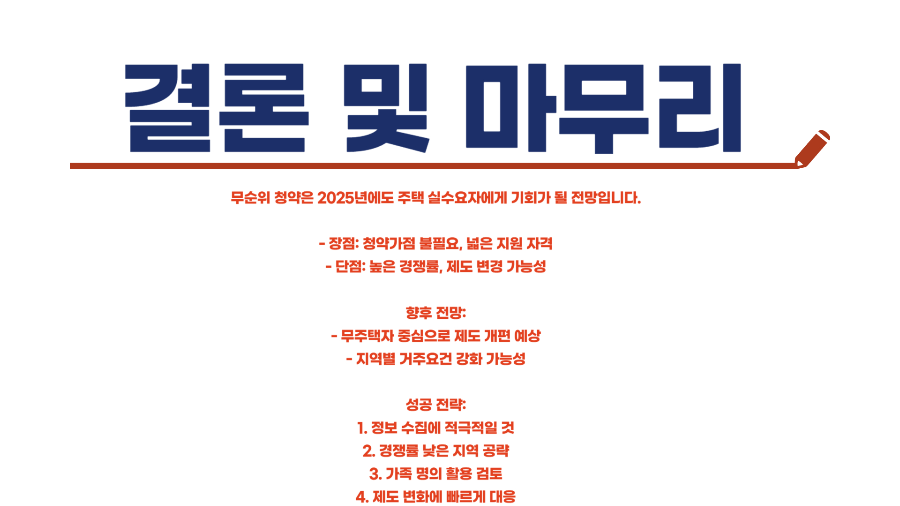 무순위 청약은 청약 가점 없이 누구나 도전할 수 있는 좋은 기회예요. 빠른 정보 확인, 경쟁률 낮은 지역 선택, 가족 명의 활용을 통해 당첨 확률을 높여보세요! 🏡🎯