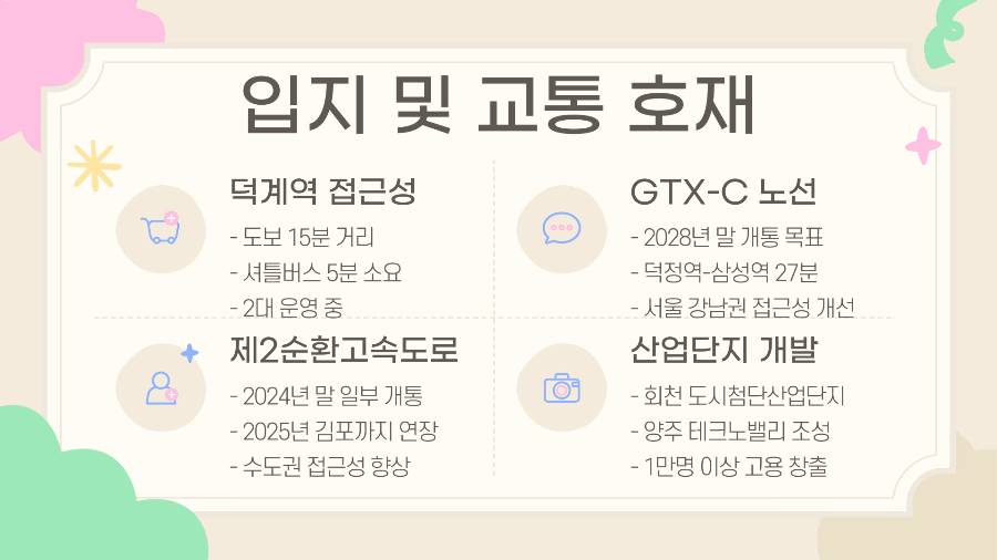 무엇보다 향후 GTX-C 노선 개통 예정으로 '덕정역 – 삼성역'까지 단 27분 소요 예정이라는 점이 이 지역의 가치를 급상승시키고 있어요. 서울 강남권과의 접근성이 크게 개선되면 양주 전체 부동산 시장이 움직일 수밖에 없죠.