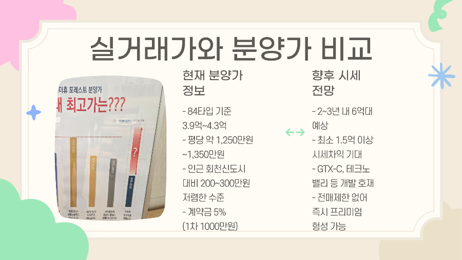 3년 전 인근 아파트 분양가가 3.7억~4.1억 수준이었는데, 현재 동일 타입 기준 실거래가는 4.9억~5.9억까지 형성되어 있어요. 특히 GTX-C와 테크노밸리 등 추가 개발 요소를 감안하면, 2~3년 내 최소 1.5억 이상의 시세차익을 기대해 볼 수 있어요.