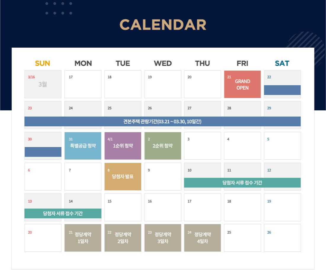 청약 일정은 3월 31일 특별공급부터 시작돼요! 일반공급은 1순위가 4월 1일, 2순위는 4월 2일에 진행됩니다.