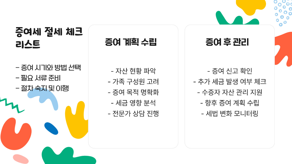 이처럼 증여도 ‘언제, 어떻게, 누구에게’ 하느냐에 따라 세금 결과는 완전히 달라져요. 내가 가진 자산과 가족 구성, 계획에 따라 꼭 맞는 방법을 설계하는 게 정말 중요해요.