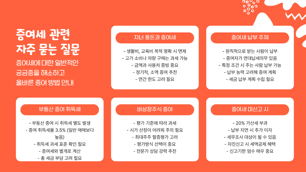 A1. 생활비나 교육비는 목적이 명확하면 증여세 면제 대상이에요. 단, 고가 소비나 차량 구매 시에는 과세될 수 있어요.