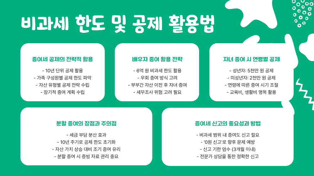 1. 💸 분산 증여 전략 한 번에 큰 금액을 주기보다는, 10년 단위로 나눠서 주는 게 좋아요. 예를 들어 자녀가 20세라면 30세 전까지 두 번의 증여 공제를 받을 수 있는 셈이에요. 배우자 공제도 적극 활용하면 좋고요.