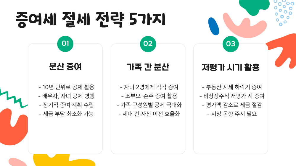 3. 🏘️ 저평가 시기 활용 부동산 가격이 상대적으로 낮을 때 증여하면 평가액이 줄어들기 때문에 세금도 함께 줄어들어요. 부동산 시장의 흐름을 잘 보는 것도 절세 전략이에요.
