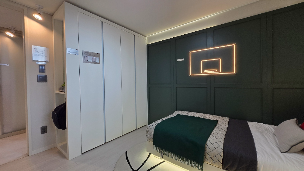 내부 구조도 정말 잘 빠졌어요. 거실은 광폭 설계로 대형 소파 배치가 가능하고, 안방도 대형 침대가 무리 없이 들어갈 만큼 여유롭죠. 드레스룸 공간이 넓게 빠져서 수납 문제도 없어요.
