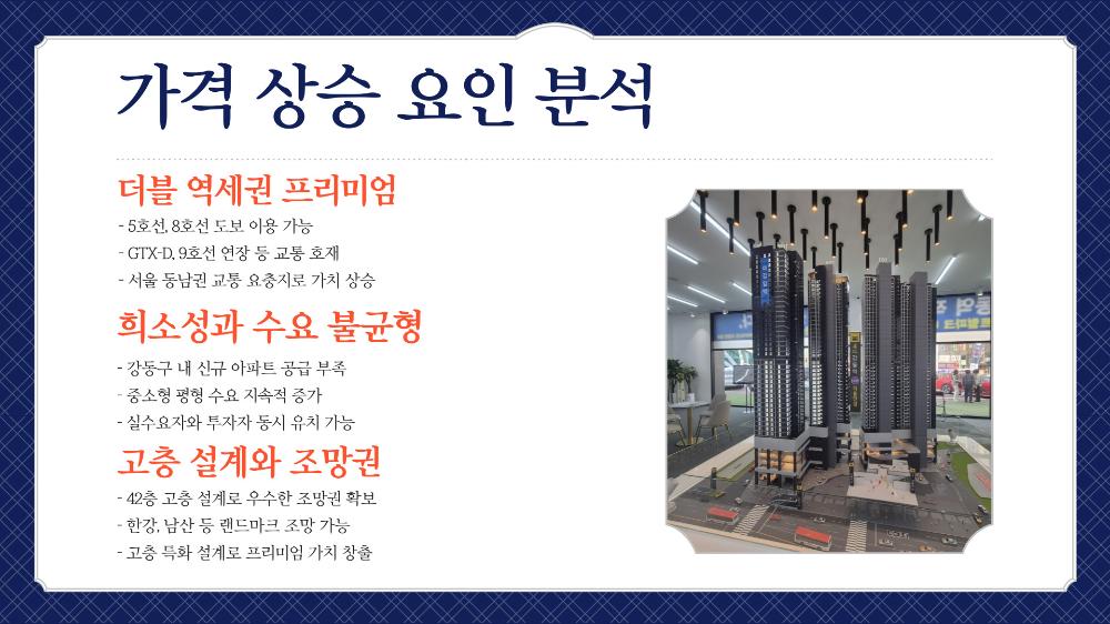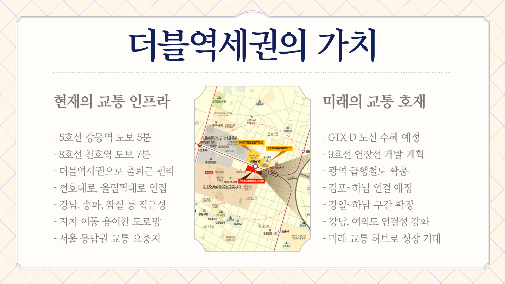 첫 번째 가격 상승 요인은 더블 역세권이에요. 앞서 말했듯 5호선 강동역과 8호선 천호역이 도보권에 있는 이중 교통 입지는 서울에서도 드물어요. 여기에 GTX-D, 9호선 연장까지 계획돼 있어 추가 교통 호재가 계속 이어지고 있어요. 이런 경우 아파트 가격은 자연스럽게 오르게 되죠.