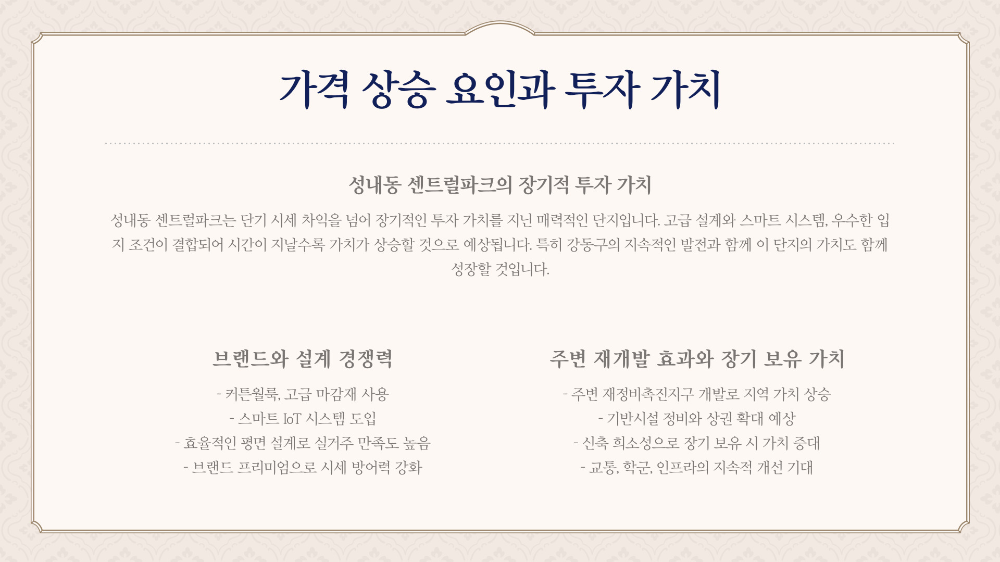이러한 교통 호재는 단기적인 집값 상승뿐 아니라 중장기적으로도 지속적인 가치 상승을 만들어내요. 교통 인프라는 시간이 지날수록 그 중요성이 더 커지기 때문에 성내동 센트럴파크는 미래에 더욱 주목받게 될 입지라는 거예요.