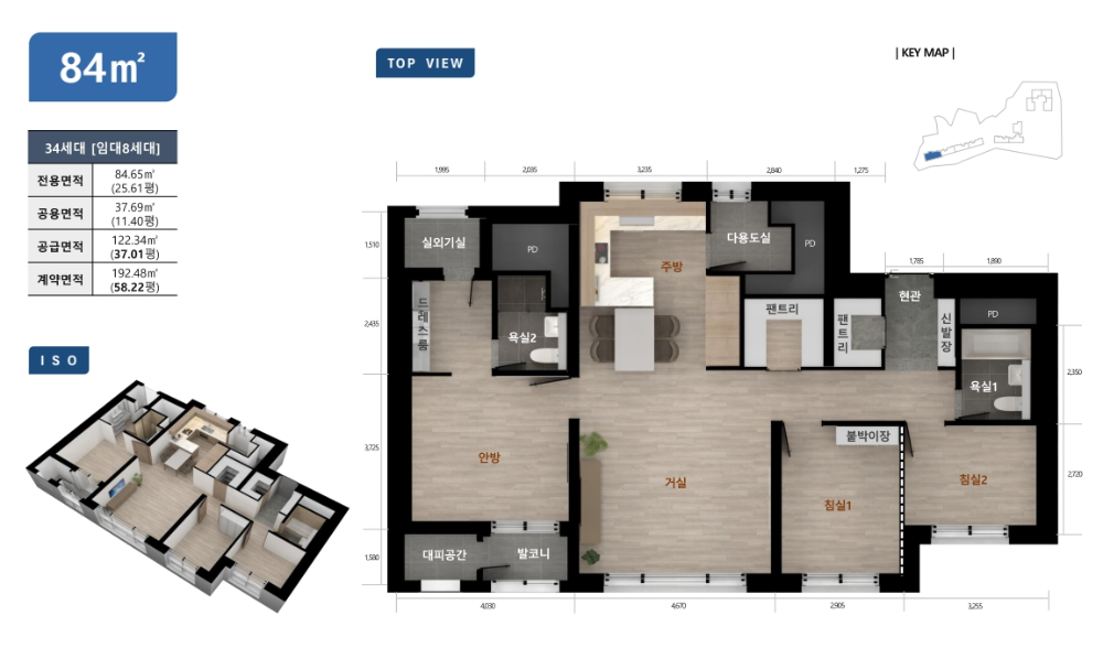 | 84㎡ | 방3 / 욕실2 | 팬트리 2개, 실외기실, 드레스룸 |