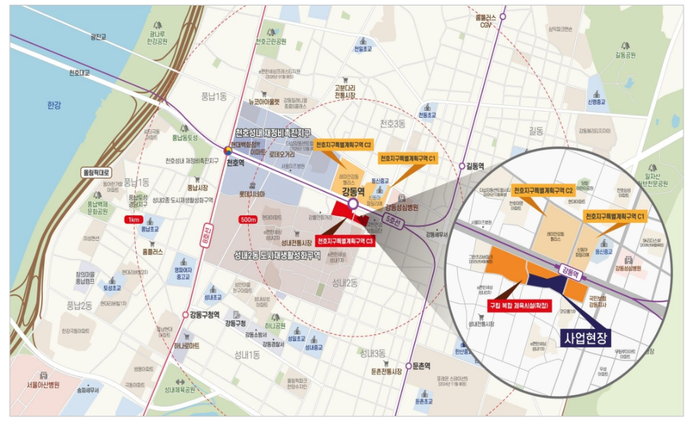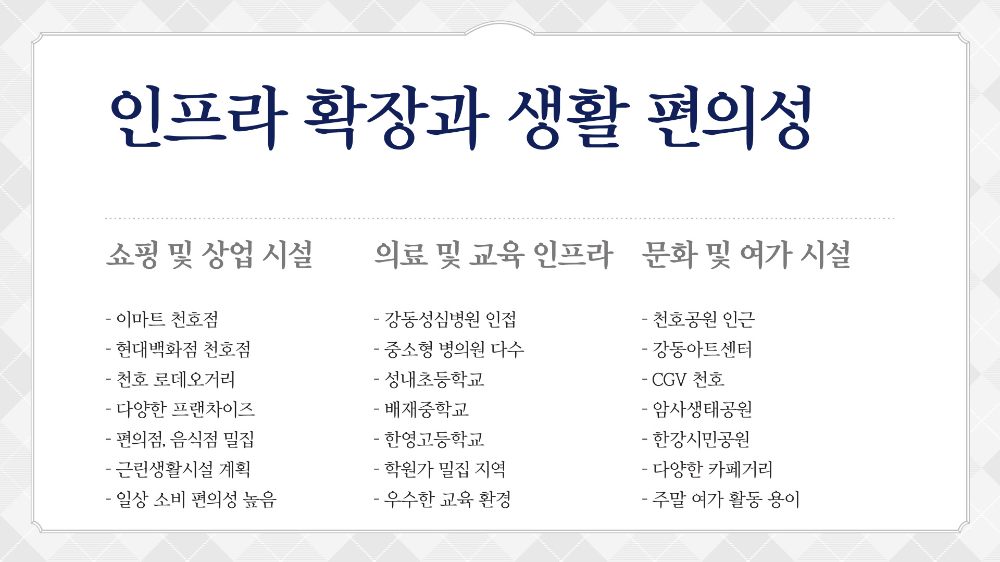 게다가 강동구는 서울 내에서도 자족 기능이 뛰어난 지역 중 하나예요. 천호동, 성내동, 암사동 등 상업 기능과 주거 기능이 동시에 어우러진 지역인데요, 이처럼 균형 있는 생활권은 수요층이 꾸준하기 때문에 장기적인 주택 수요가 유지된다는 장점이 있어요.