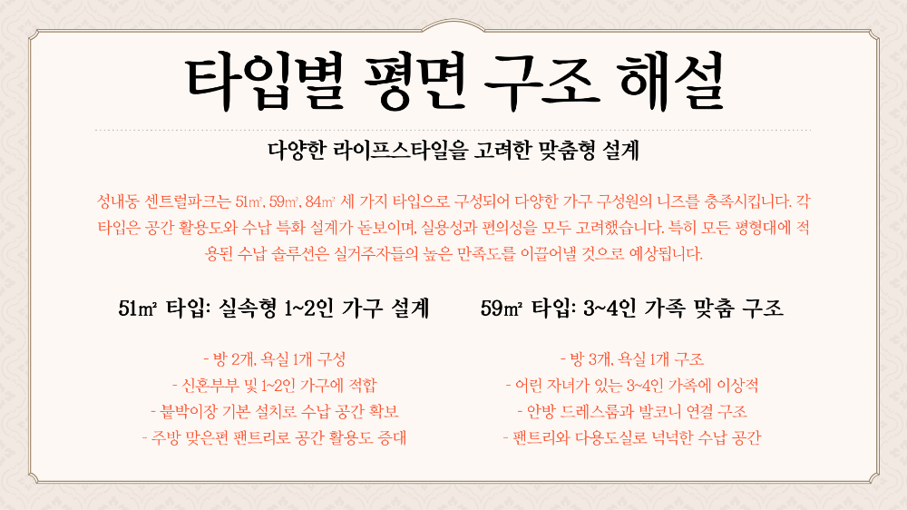 성내동 센트럴파크는 51㎡, 59㎡, 84㎡ 세 가지 타입으로 구성되어 있어요. 각 타입마다 세밀한 공간 설계가 돋보이며, 실수요자 중심의 구조로 인기가 높아요. 특히 공간 활용도와 수납 특화 설계가 돋보이는 것이 특징이에요.