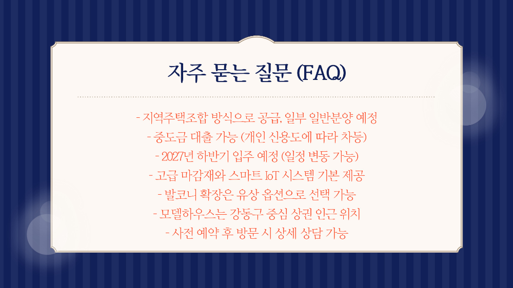 A8. 강동구 중심 상권 인근에 위치해 있어요. 사전 예약 후 방문하면 상담 및 구조도, 샘플 하우스를 확인할 수 있어요.