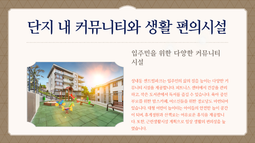 무엇보다 커뮤니티 시설은 향후 단지의 입주 만족도를 크게 좌우하는 요소인데요, 성내동 센트럴파크는 이 부분에서 우수한 점수를 받을 수 있는 요소들을 이미 확보하고 있어요. 특히 실수요자 입장에서 커뮤니티와 생활 편의시설은 실제로 살아보면 더욱 큰 만족을 느끼게 되는 부분이에요.